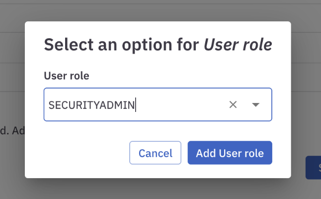 Select a user role. A role that’s equivalent to SECURITYADMIN is required.